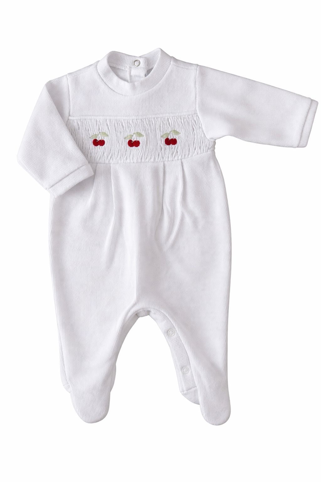 Macacão em tricotil na cor branco com bordado de cerejinhas. Possui abotoamento nas costas e nas entrepernas, facilitando a troca do bebê. Confeccionado em malha tricotada 100% algodão, tornando-se uma peça com toque macio e confortável para o bebê.