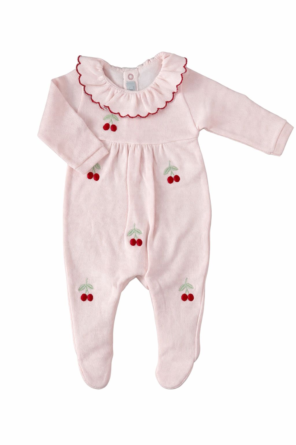 Macacão em tricotil na cor rosa com gola babado e bordado cerejinha. Possui abotoamento nas costas e nas entrepernas, facilitando a troca do bebê. Confeccionado em malha tricotada 100% algodão, tornando-se uma peça com toque macio e confortável para o bebê.