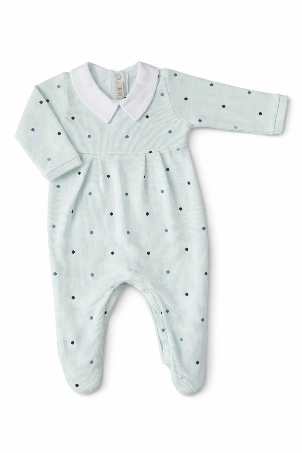 Macacão em tricotil na cor azul claro com bordado poá em tons de azuis. Possui abotoamento nas costas e nas entrepernas, facilitando a troca do bebê. Confeccionado em malha tricotada 100% algodão, tornando-se uma peça com toque macio e confortável para o bebê.