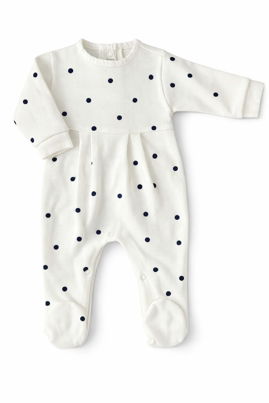 Macacão em tricotil na cor off white com poá azul marinho. Possui abotoamento nas costas e nas entrepernas, facilitando a troca do bebê. Confeccionado em malha tricotada 100% algodão, tornando-se uma peça com toque macio e confortável para o bebê.
