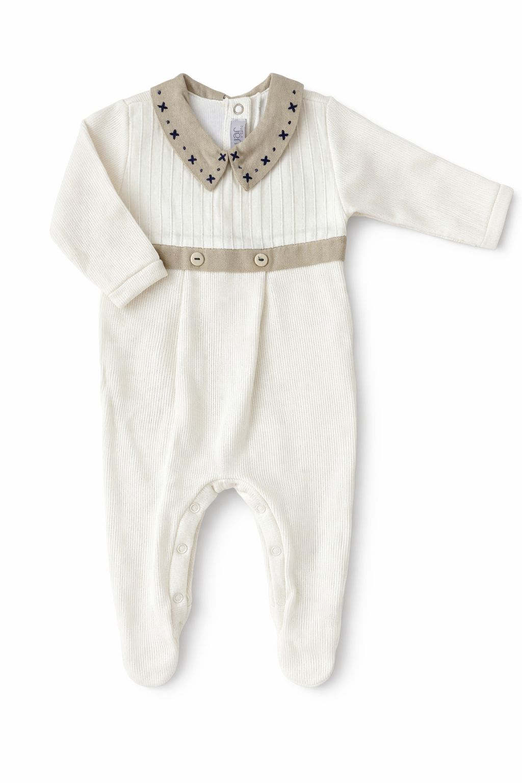 Macacão em tricotil na cor off white nervura com gola bege e botões. Possui abotoamento nas costas e nas entrepernas, facilitando a troca do bebê. Confeccionado em malha tricotada 100% algodão, tornando-se uma peça com toque macio e confortável para o bebê.
